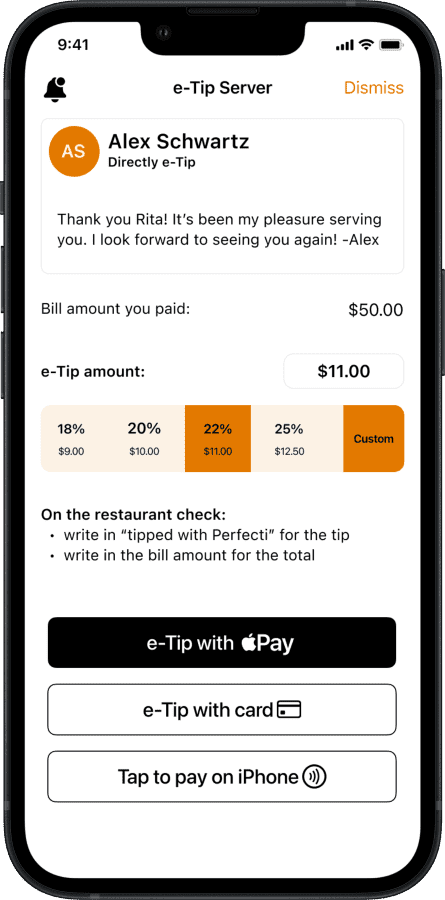 With PERFECTi, tips go directly from Guests to Server bank accounts in real time - bypassing your restaurant.